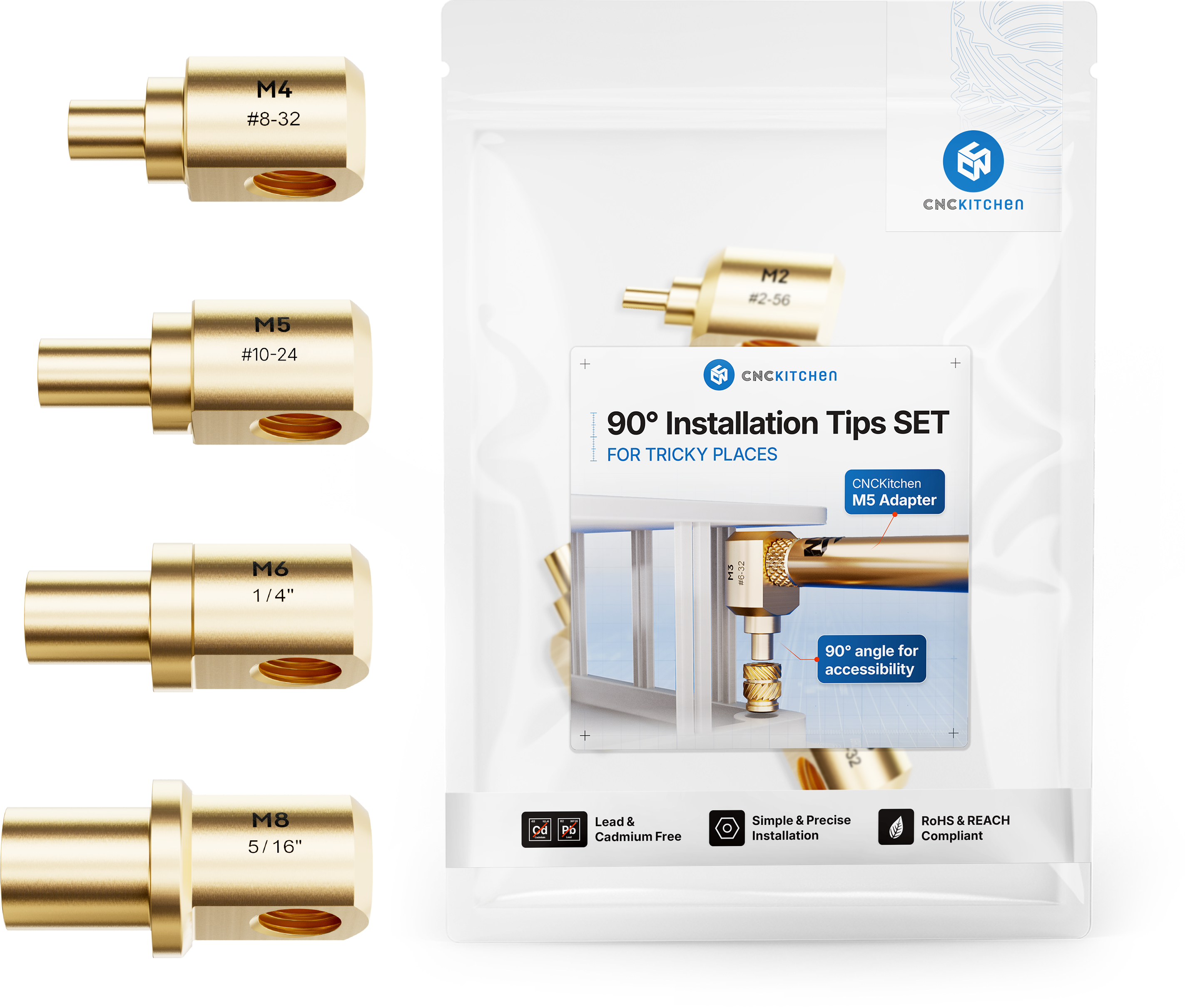 Tato CNC Kitchen 90° Tavicí pomůcky jsou perfektním doplňkem pro všechny CNC Kitchen adaptéry se závitem M5. Tavicí pomůcka zajišťuje vynikající tepelnou vodivost a díky jednoduché výměně umožňuje rychlou a nekomplikovanou výměnu.