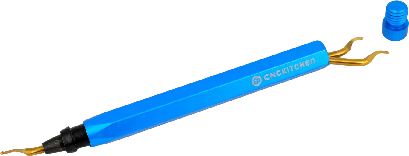 CNC Kitchen Odhrotovač je vysoce kvalitní přesný nástroj pro čisté následné opracování hran a otvorů. Rukojeť je vyrobena z robustního hliníku a poskytuje vysokou stabilitu při současně nízké hmotnosti.