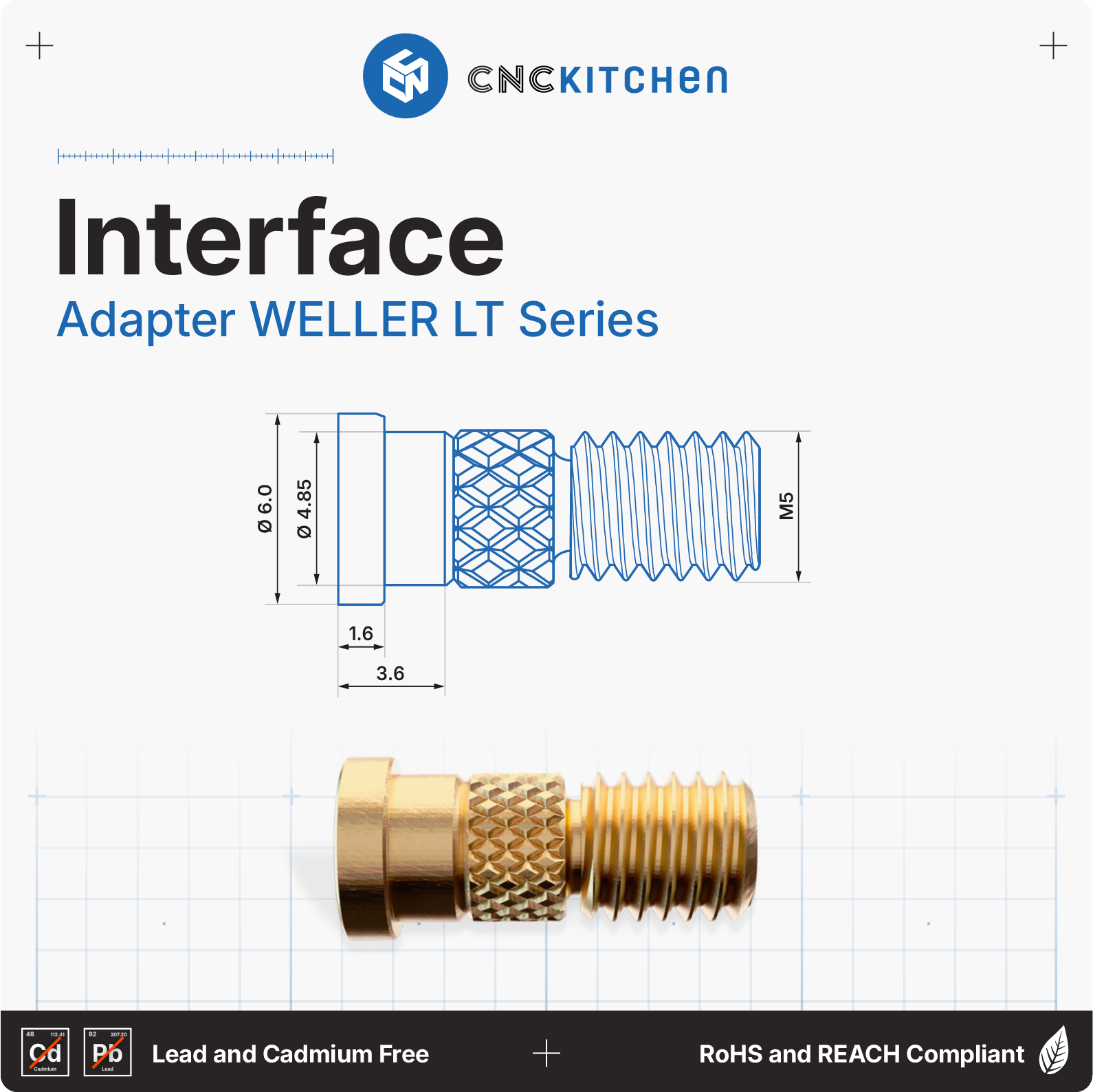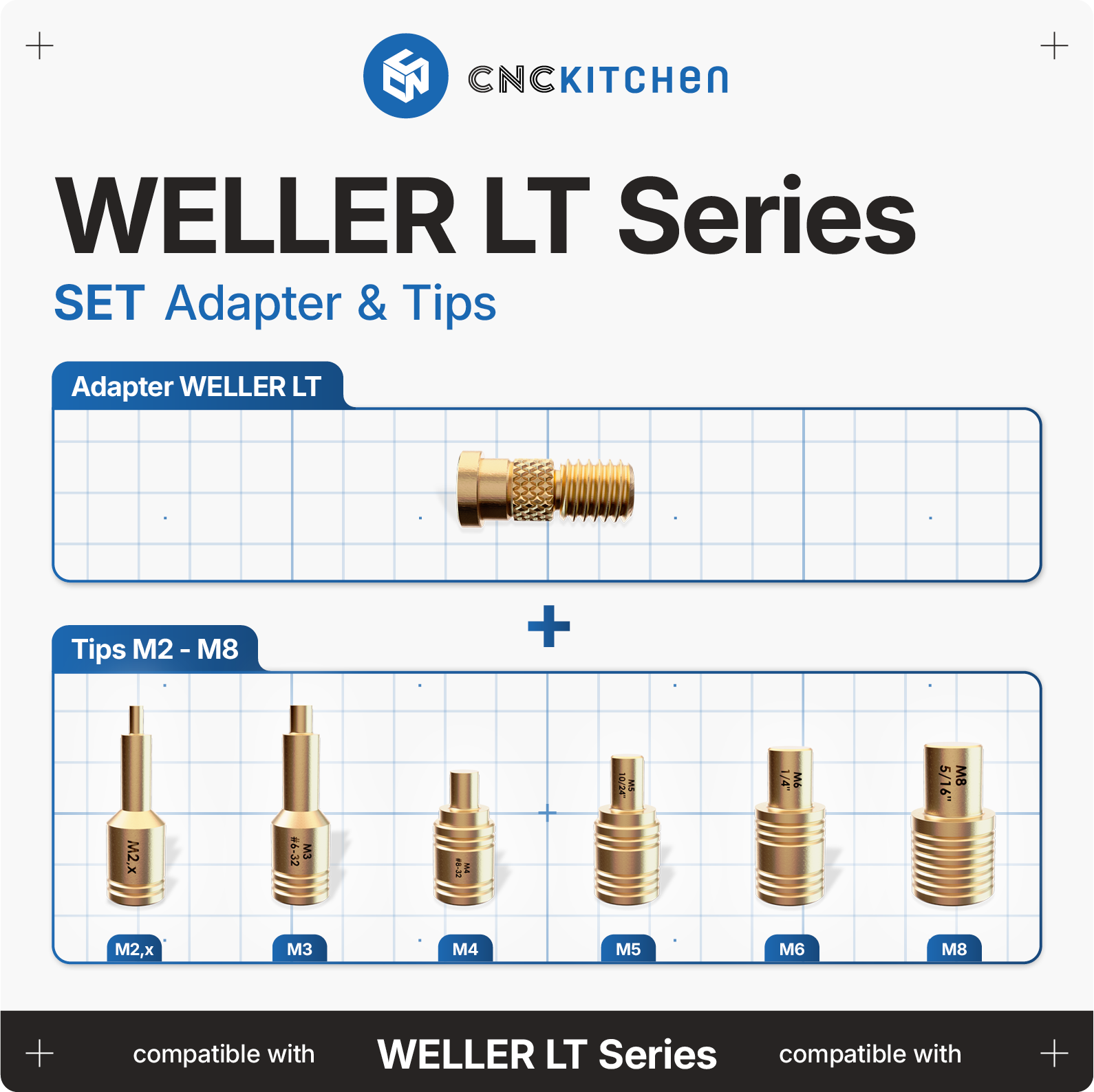 Pájecí hroty jsou kompatibilní s páječkami Weller LT (např. WSP 80) a dokonale pasují k závitovým vložkám od CNC Kitchen. Mají laserové značení a zářezy pro snadnou identifikaci velikosti a jsou v souladu se směrnicemi REACH.