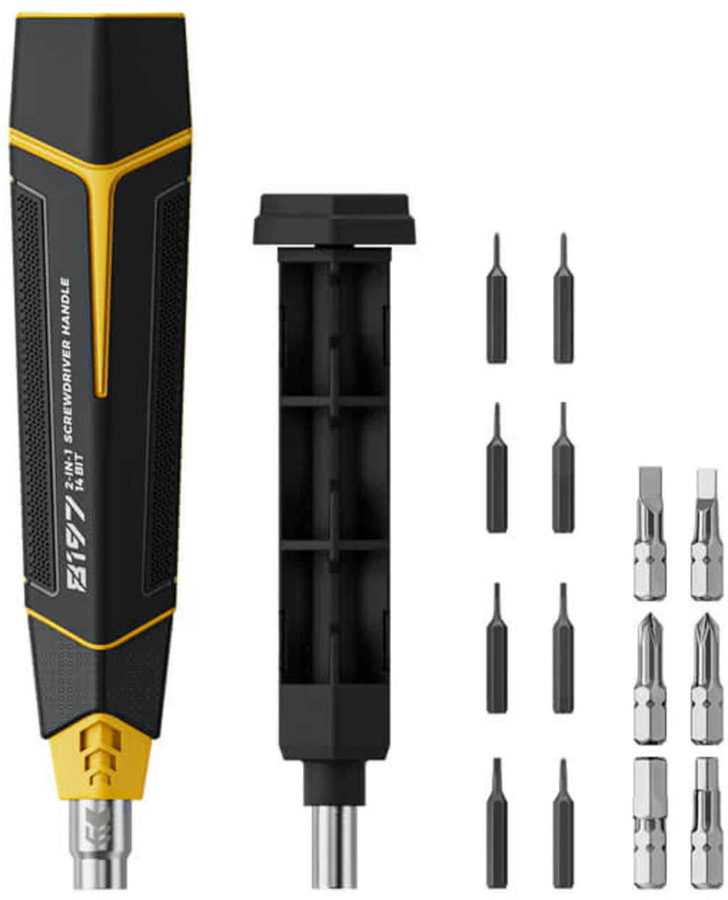Kvalitní bity z materiálu CR-V s tvrdostí 50–54 HRC zajišťují vysokou odolnost a chrání šrouby před poškozením. Praktické uložení bitů uvnitř rukojeti zajišťuje jejich okamžitou dostupnost a zároveň chrání okolní nástroje.