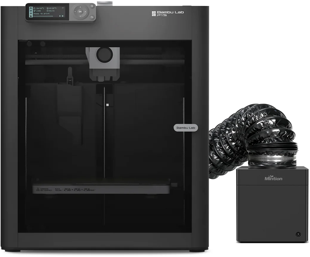 Kompaktní design umožňuje použití přímo v krytu nebo vedle 3D tiskárny. Standardně je systém kompatibilní s Bambu Lab P1S/X1C a díky připojení hadice o průměru 100 mm jej lze pomocí vhodných adaptérů flexibilně použít i s dalšími uzavřenými tiskárnami, jako jsou Prusa, Creality, Elegoo nebo Flashforge. Upozornění: Mintion aktuálně nenabízí vlastní adaptéry. V komunitě jsou však již dostupné 3D tisknutelné soubory adaptérů pro různé modely tiskáren. Seznam najdete zde. |