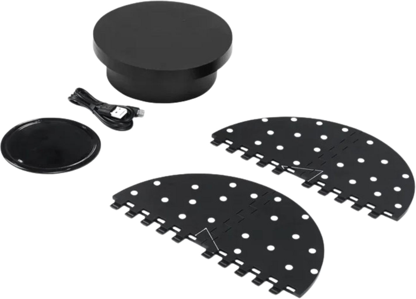 | Rozsah dodávky | 1x Mini otočný stůl 1x Opakovaně použitelný Sticky Pad 1x Napájecí kabel (USB Type-A na Type-C) pro otočný stůl 1x Prodlužovací kabel 1x Nástavec na otočný stůl |
