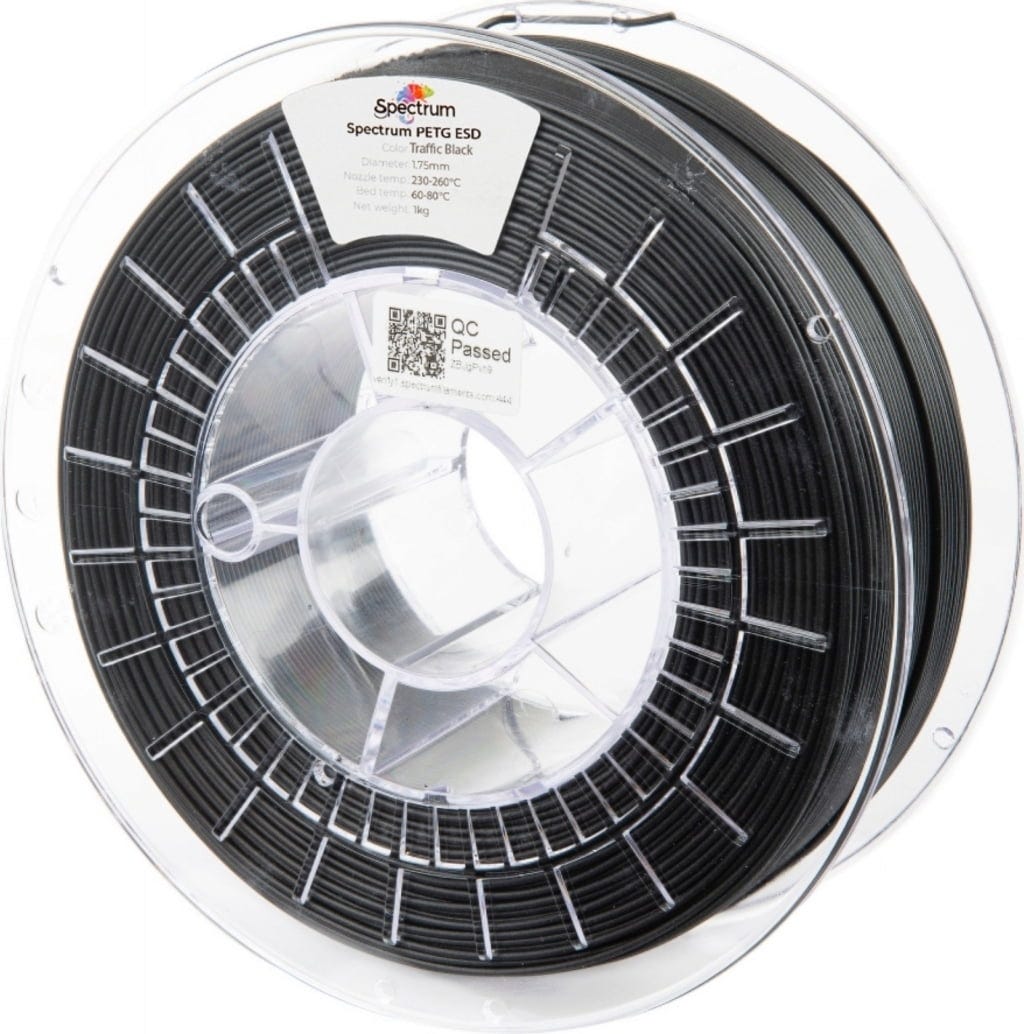 Spectrum PETG ESD je profesionální antistatický filament vyvinutý pro prostředí, kde představují elektrostatické výboje reálné riziko. Díky speciálně navržené, trvale účinné ESD formulaci kombinuje tento materiál robustnost a snadný tisk PETG s bezpečnou ochranou pro elektroniku, měřicí přístroje i zóny s nebezpečím výbuchu (EX/ATEX). Matný povrch navíc dodává výtiskům kvalitní technický vzhled, ideální pro profesionální použití a funkční díly s vysokou přesností.