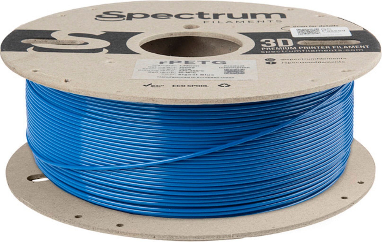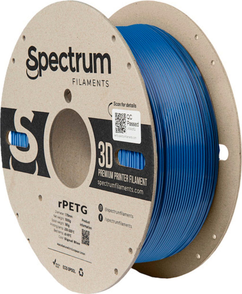 Spectrum RPETG je recyklovaný materiál pro 3D tisk, který je vyráběn použitím recyklovaného PETG, respektive využitím extruzních odpadů. Surový materiál je shromažďován, drcen, znovu míchán a následně zpracován do vysoce kvalitního PLA filamentu s nižší ekologickou zátěží. Materiál si zachovává vlastnosti klasického PETG, například snadnou tisknutelnost a nízké smrštění, a kombinuje je s relativně vysokou pevností v tahu.